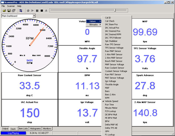 We have developed 4 versions of control definitions to work with ScannerPro, MEFI-1, MEFI-2, MEFI-3, and MEFI-4. There are many parameters, flags, warnings, and MALF trouble codes to be monitored and logged for each generation of the MEFI ECM. For complete details and screen shots of ScannerPro, see our ScannerPro page and Mark Mansur's ScannerPro.net webpage